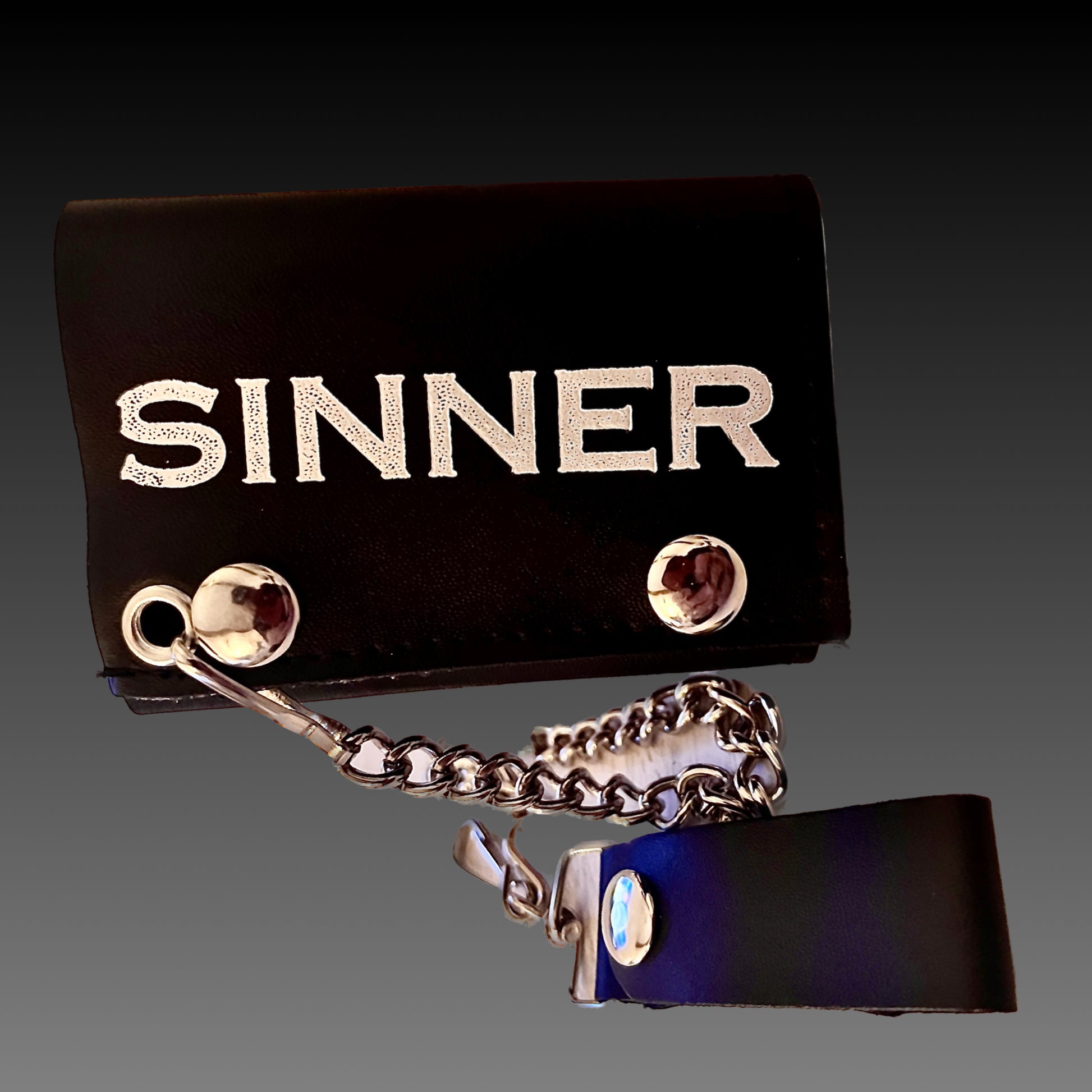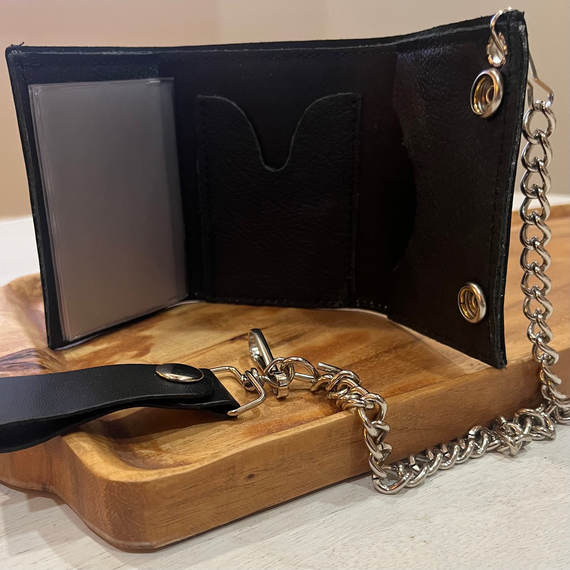 Cartera triple de cuero genuino de 4,5”x3” con cadena desmontable de 12”, ranuras para tarjetas de crédito e inserto con fotografías de 6 páginas.