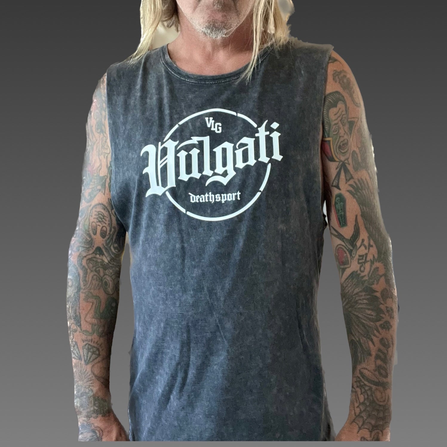 Impresión por transferencia de calor Vulgati Deathsport Circle en el frente central. Lavado a la piedra para ese sentimiento de uso y abuso.