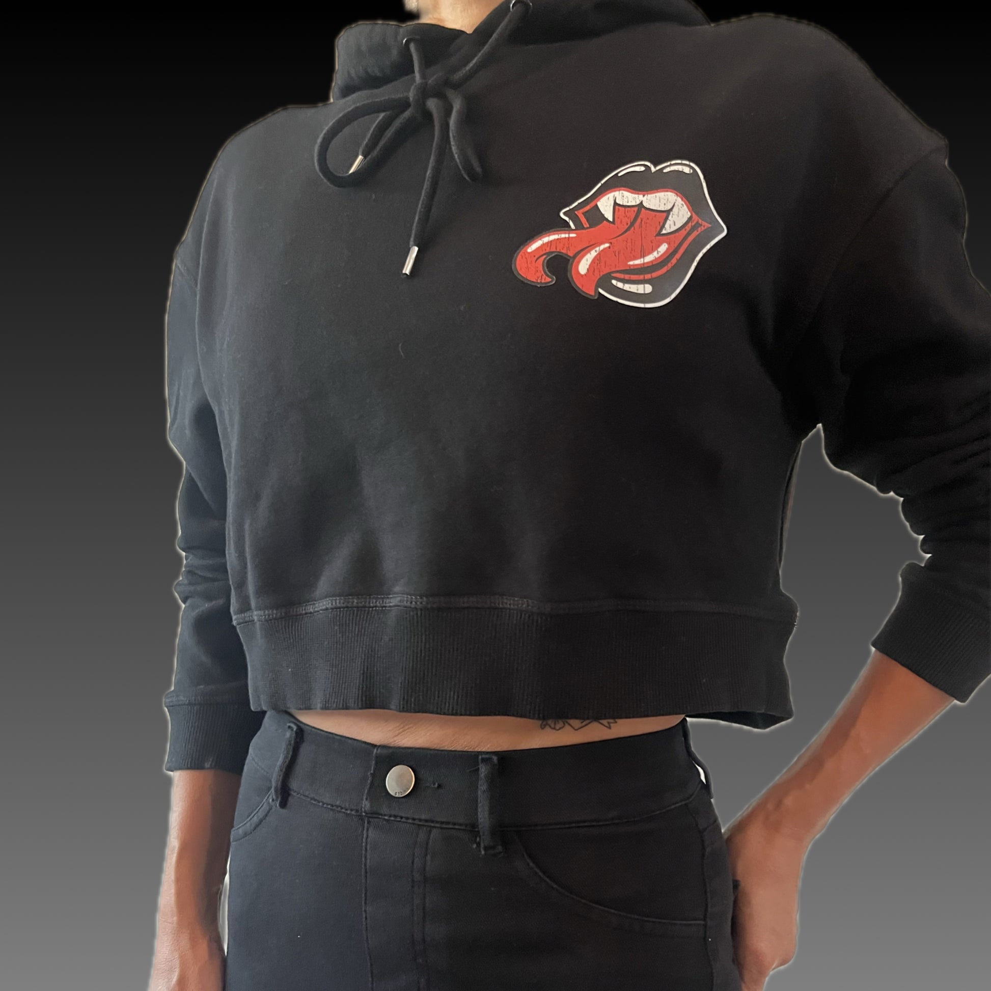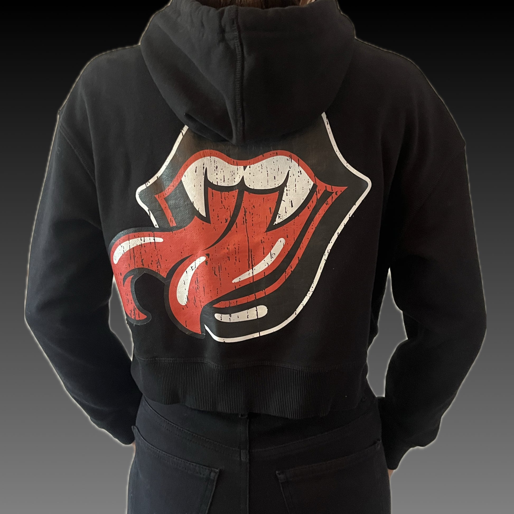 Sudadera con capucha de otoño perfecta. Estilo acogedor y recortado, labios letales con estampado pequeño en el lado izquierdo del pecho y labios grandes en la espalda.