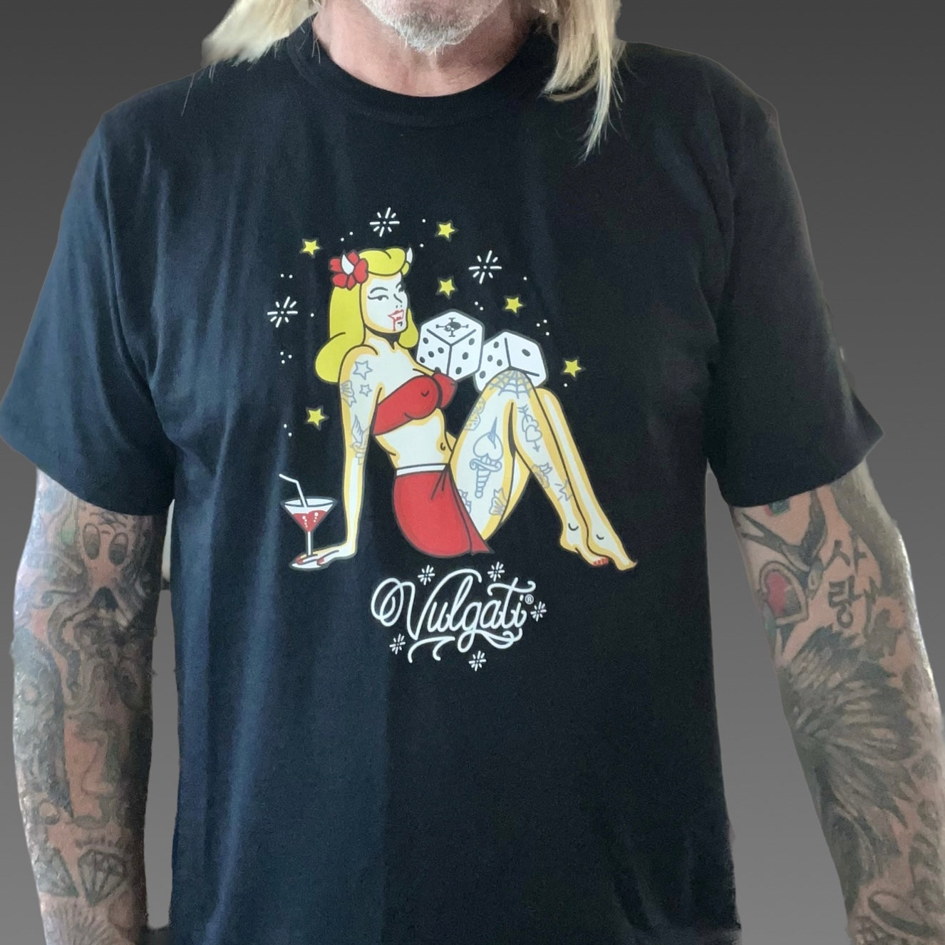 Vulgati Tattooed bombshell front chest heat transfer print. This is cozy vintage jersey tee. It honestly feels like that tshirt you've owned for a few years.
