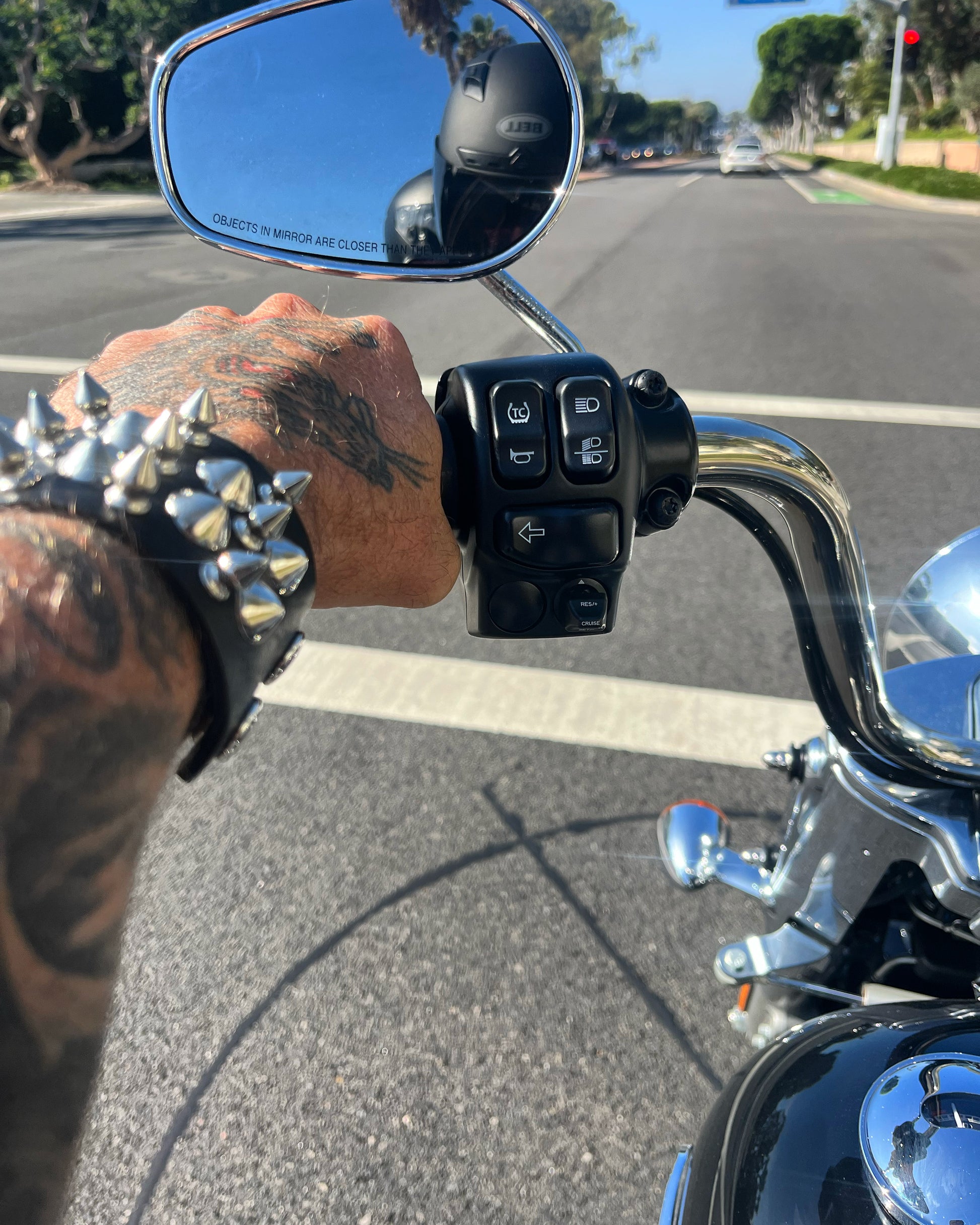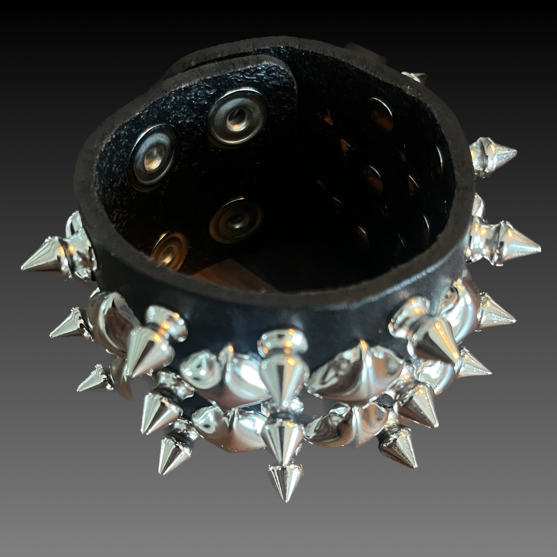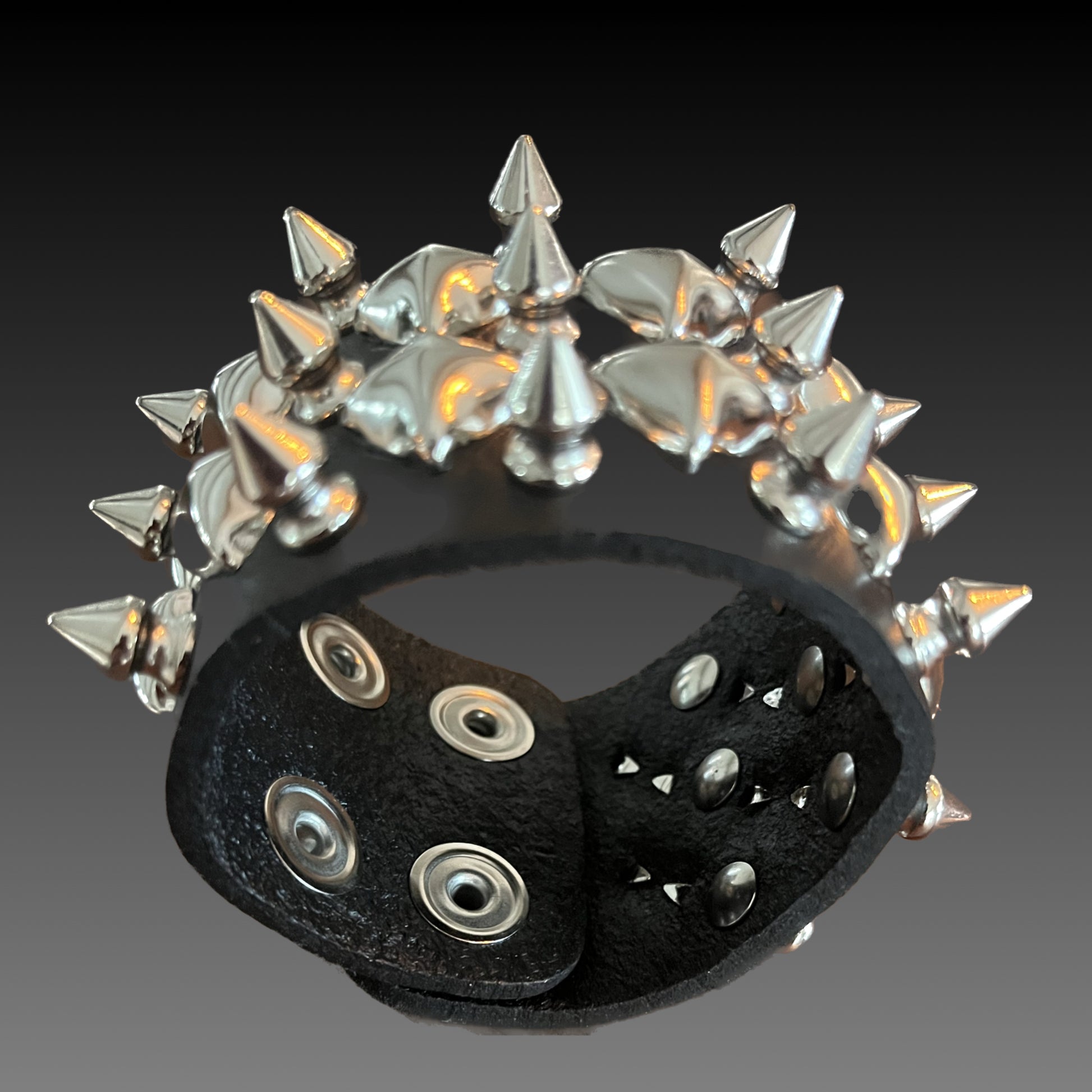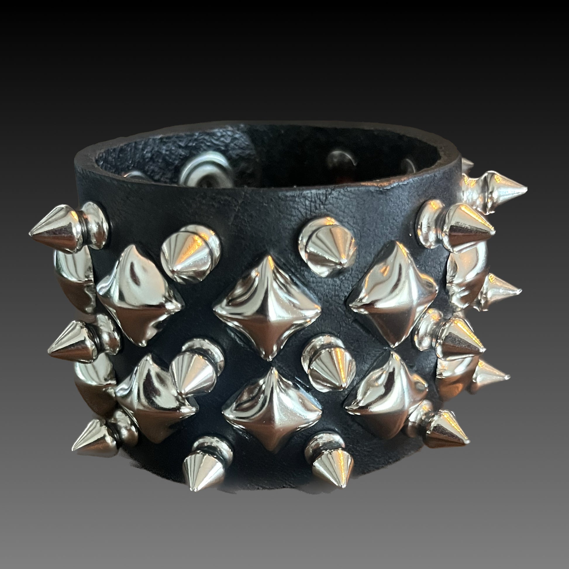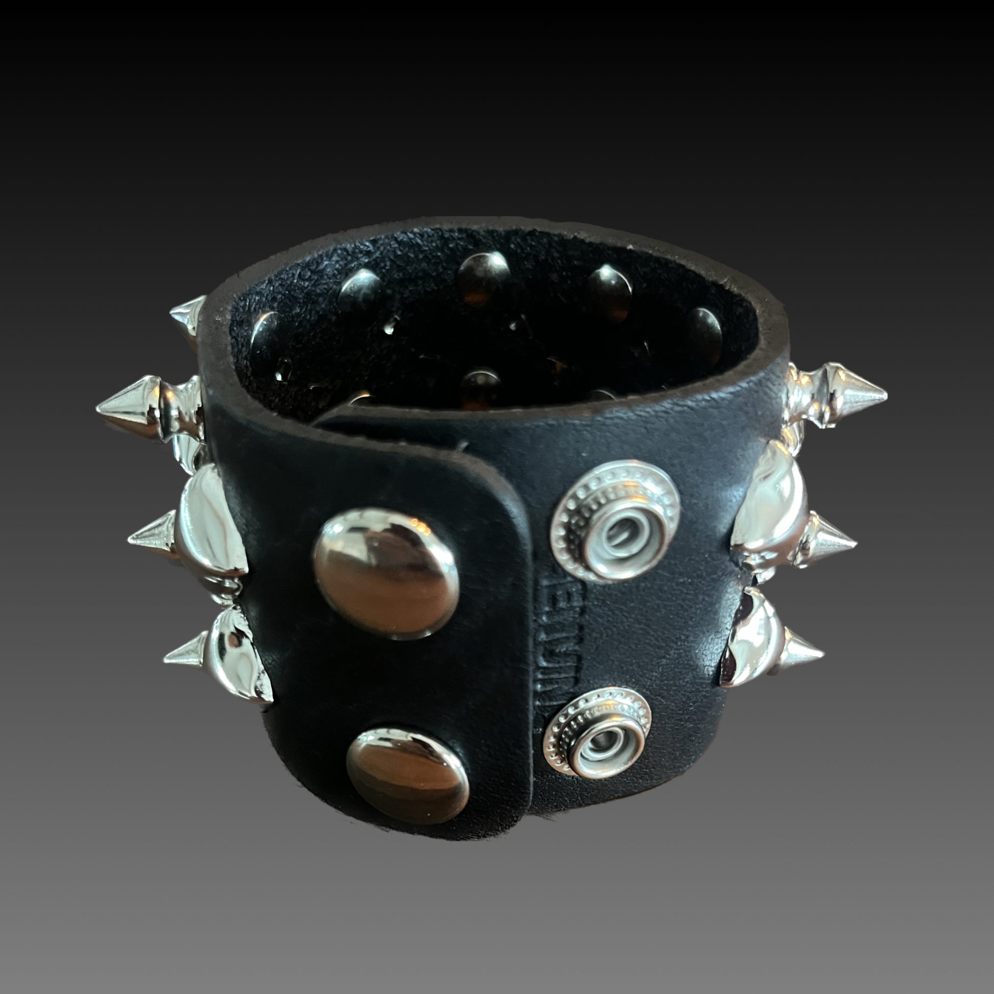 Genuine leather 2” (2) pyramids (3) row spiked wristband adjustable snap closure. Made in USA.