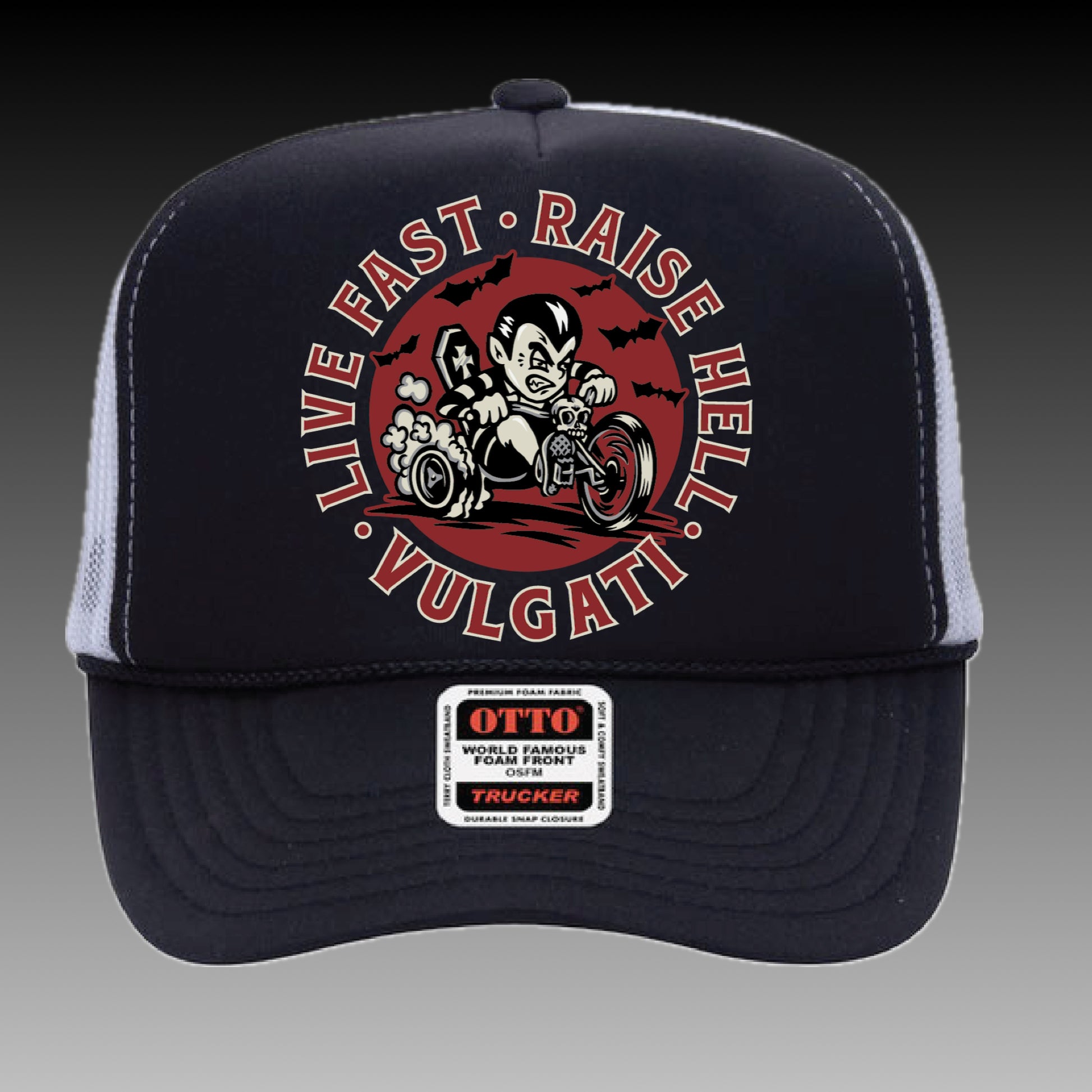 Foam front, mesh back. Plastic adjustable strap. One size fits most.