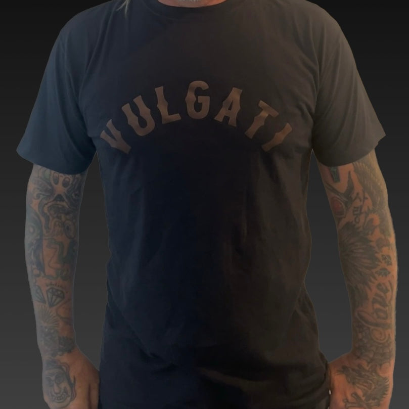 Heat transferred flock print at front chest , vulgati arched lettering.