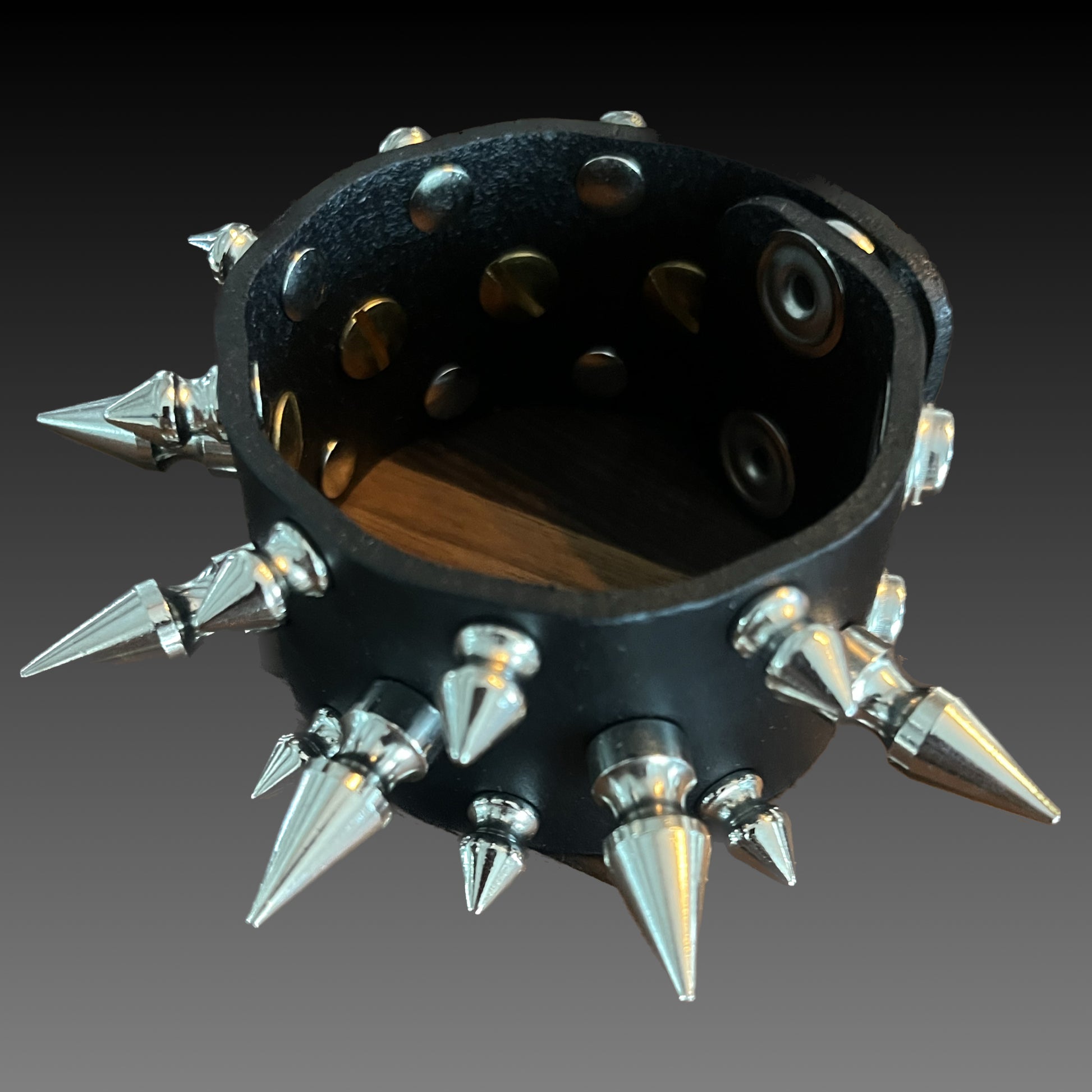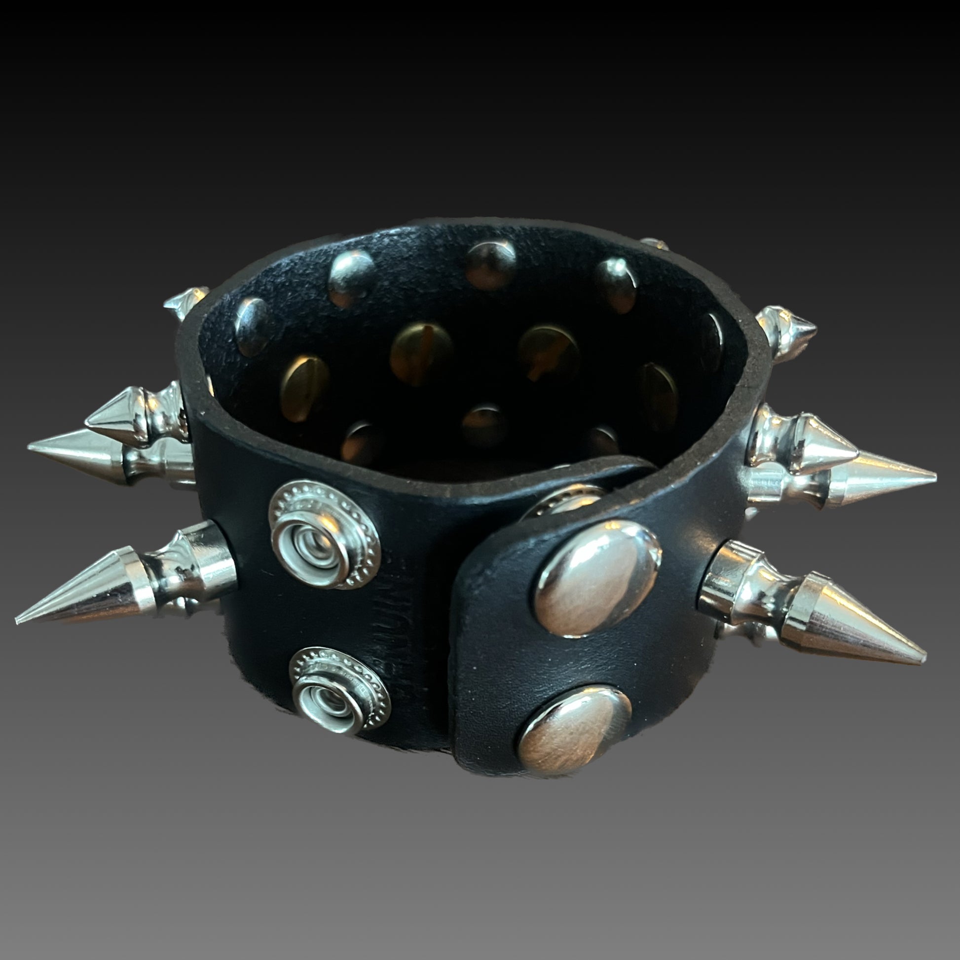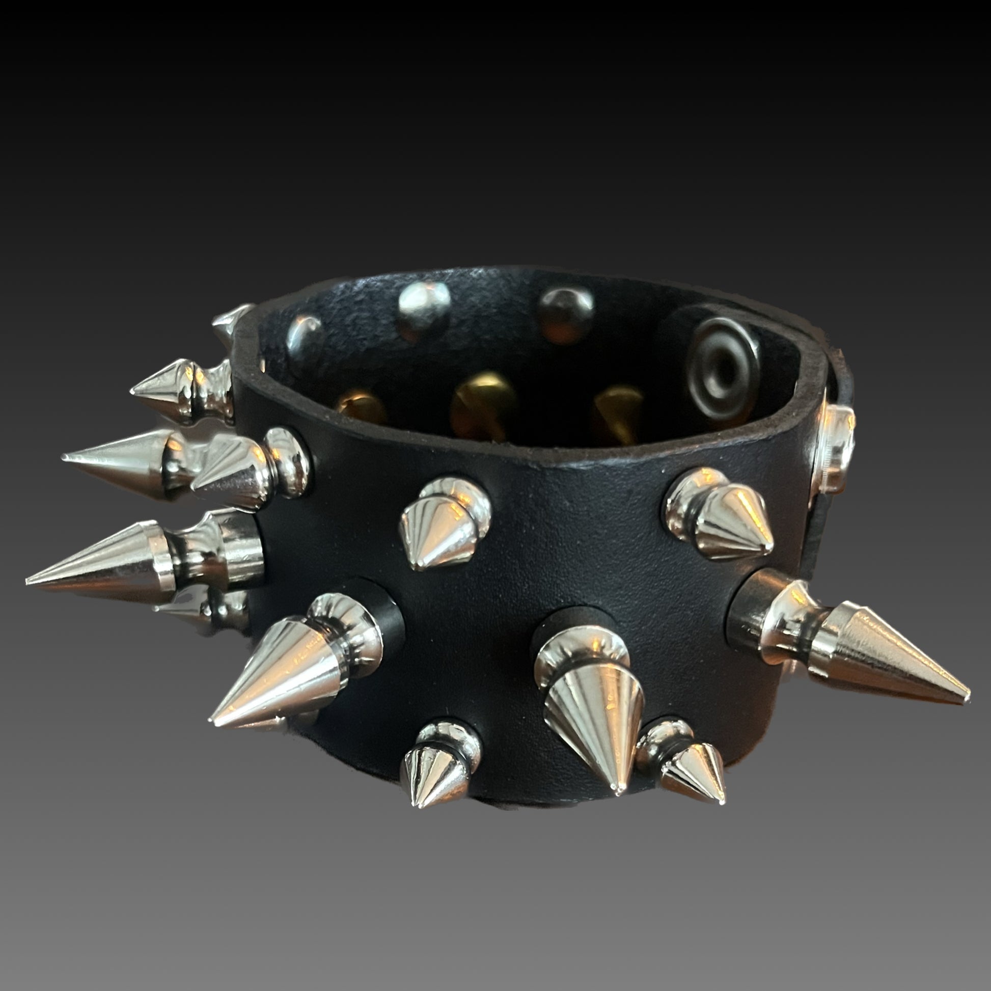 Genuine leather 1 1/2” spiked wristband with large and small metal spikes and adjustable snap closure. Made in USA.