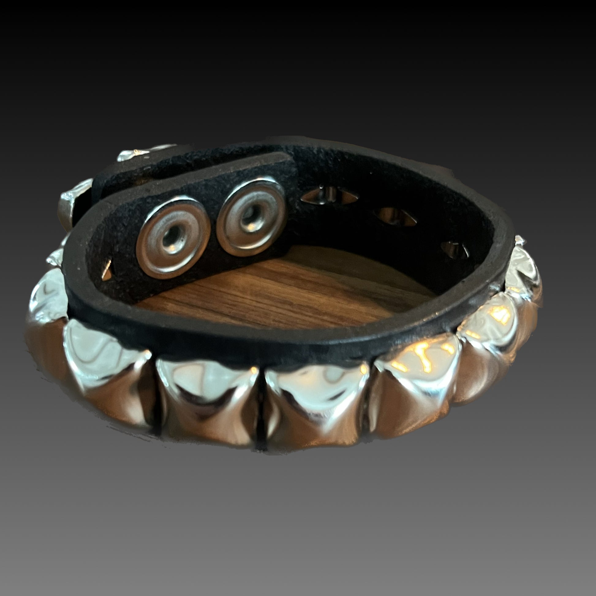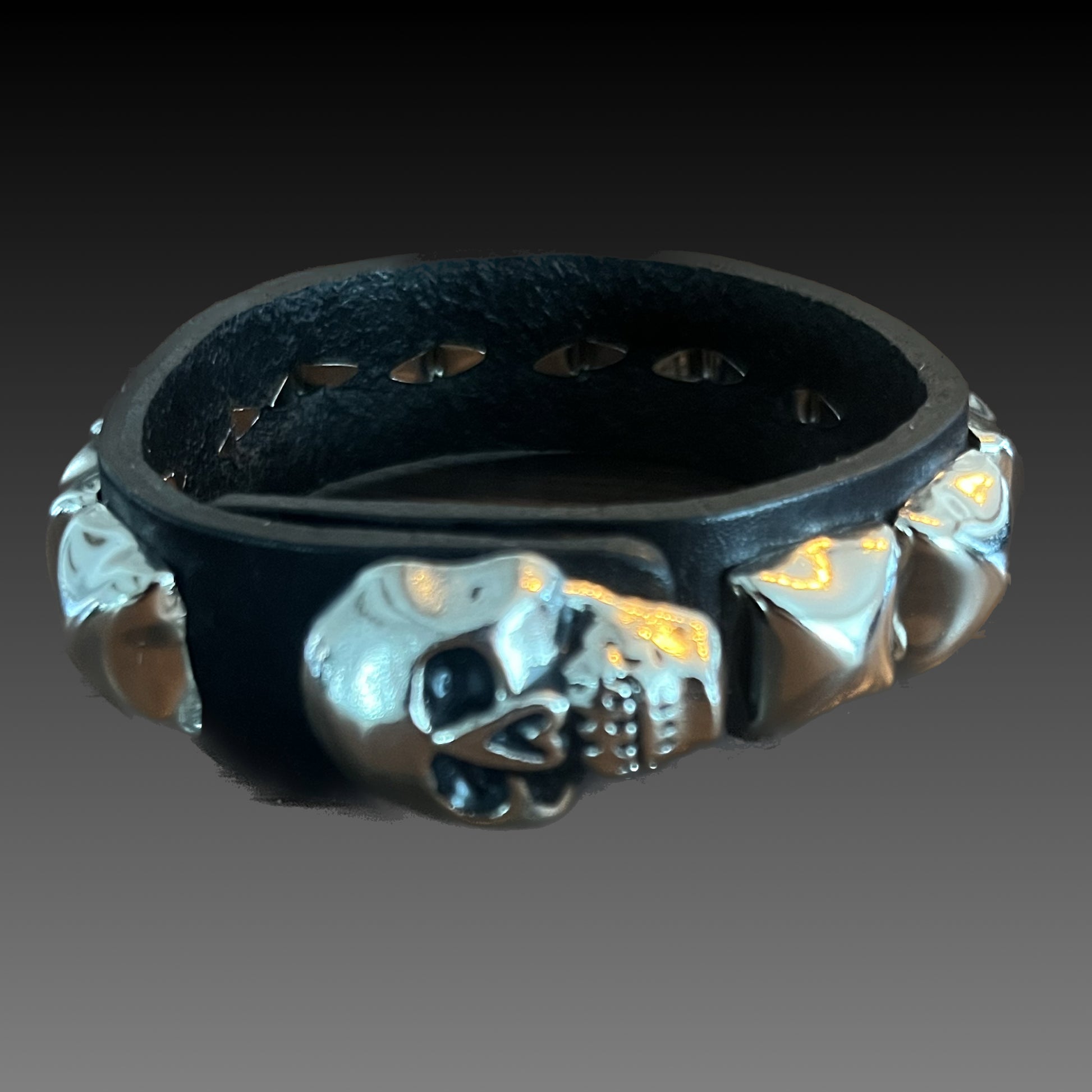Genuine leather studded bracelet with metal skull adjustable snap closure.