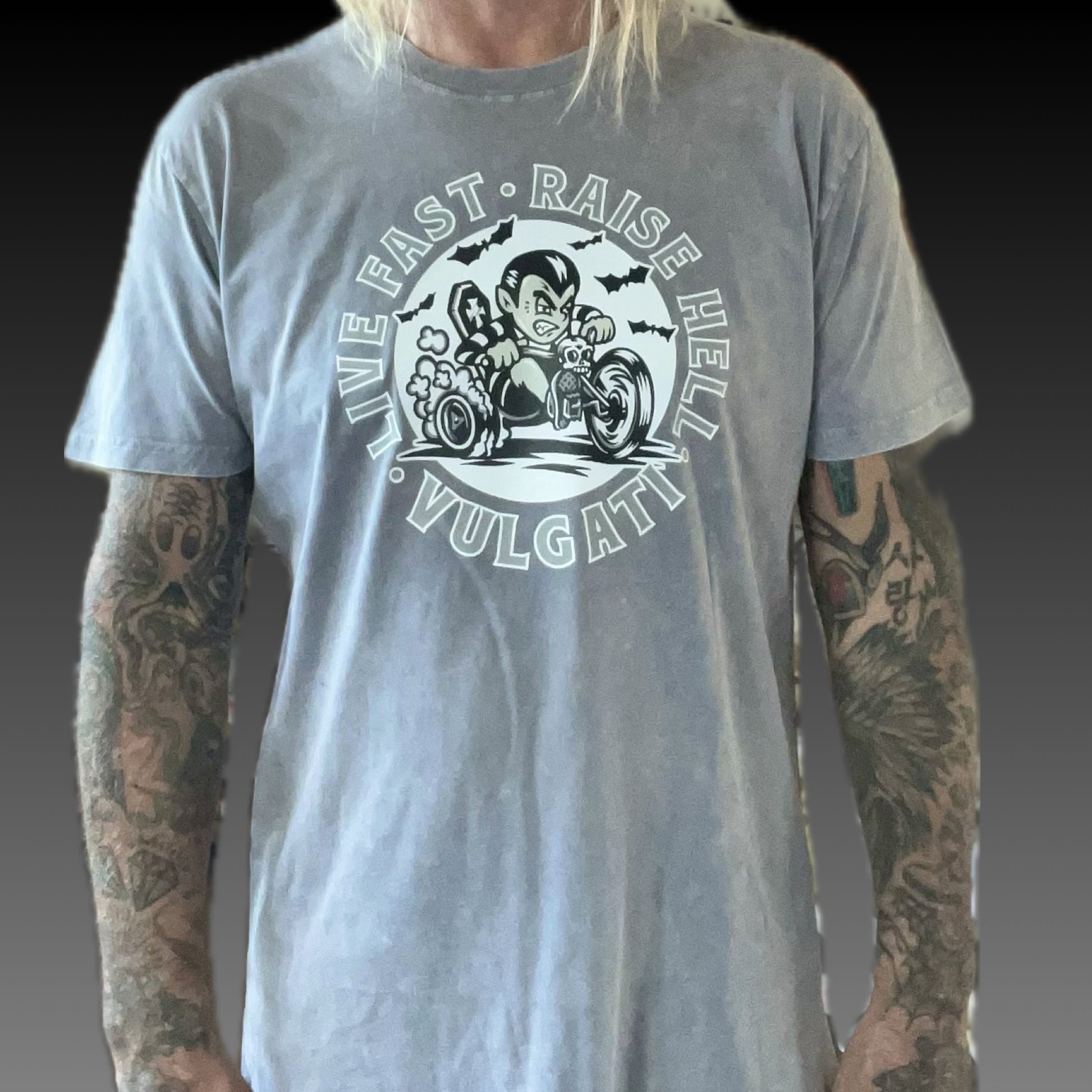 Vulgati Eddie Munster Big Wheelin heat transfer print at center chest. Stone washed for that used and abused feel.