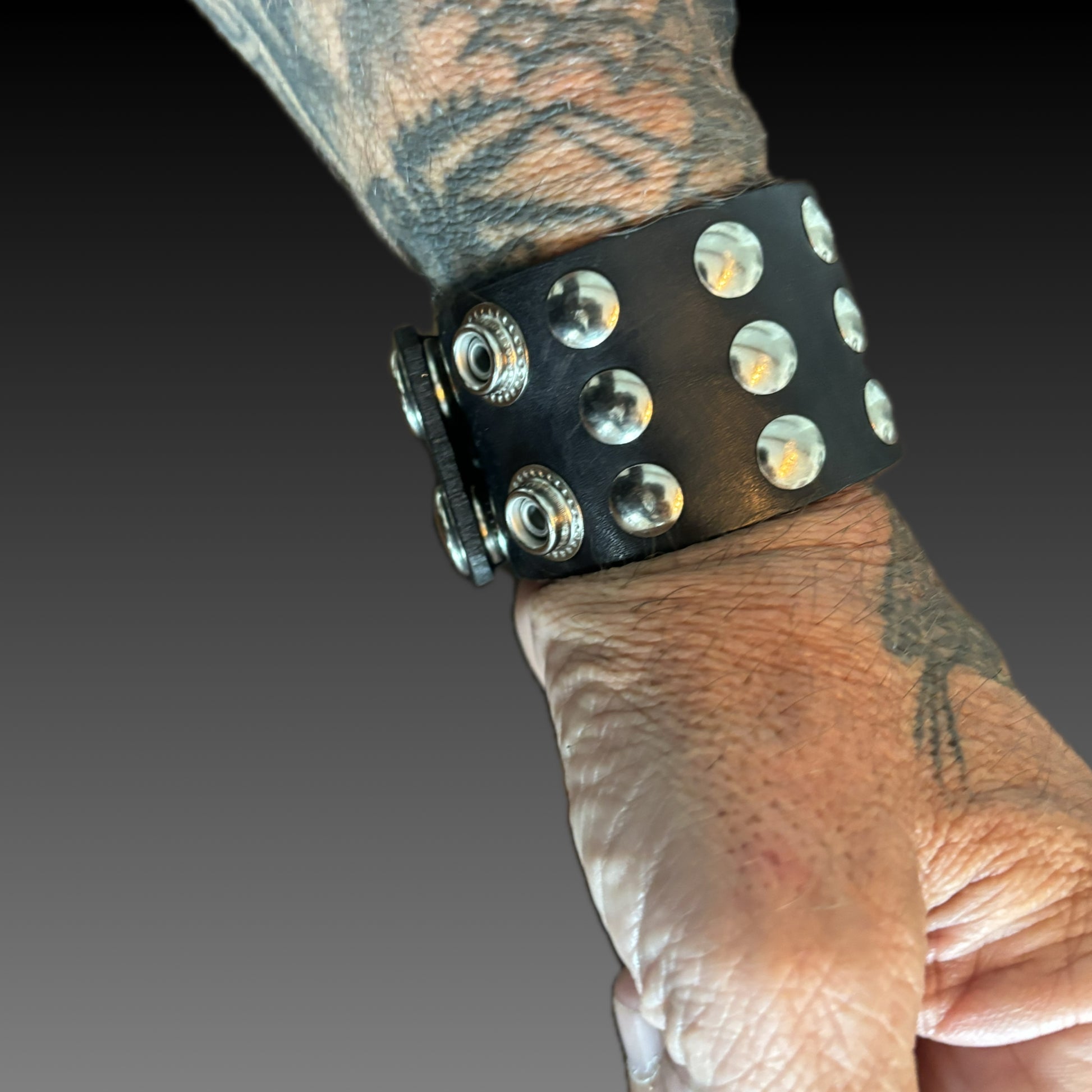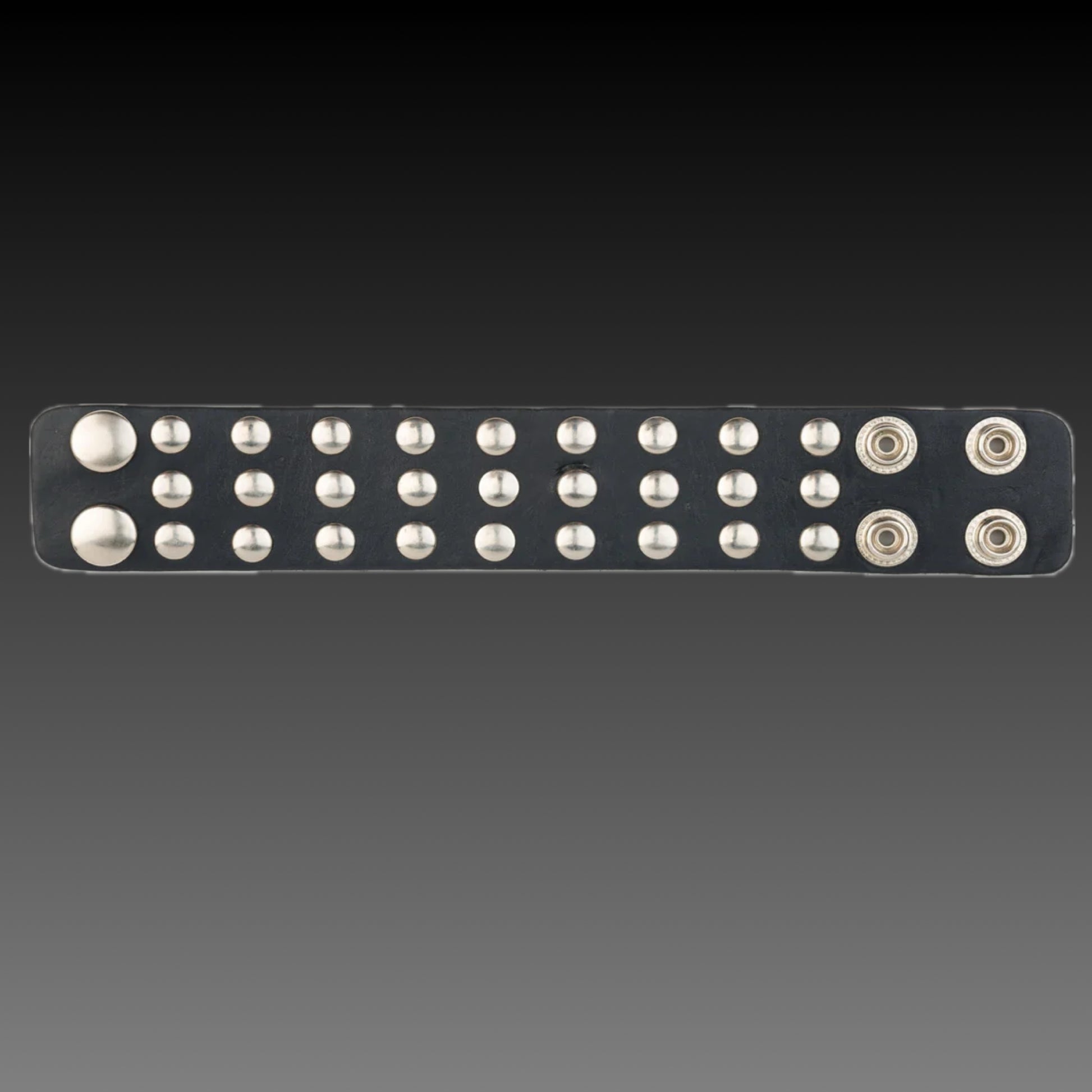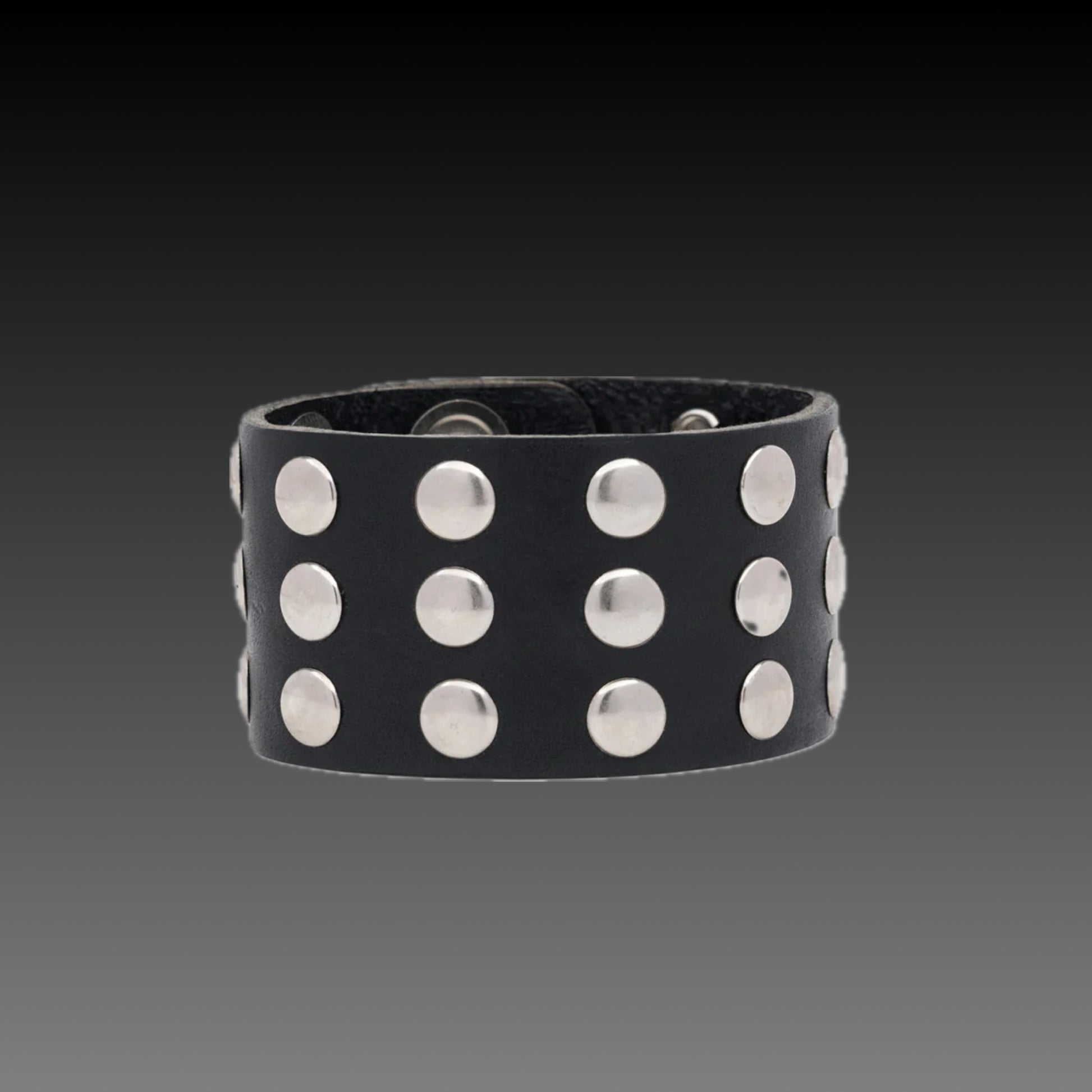 Genuine leather (3) row round studded wristband adjustable snap closure. Made in USA.