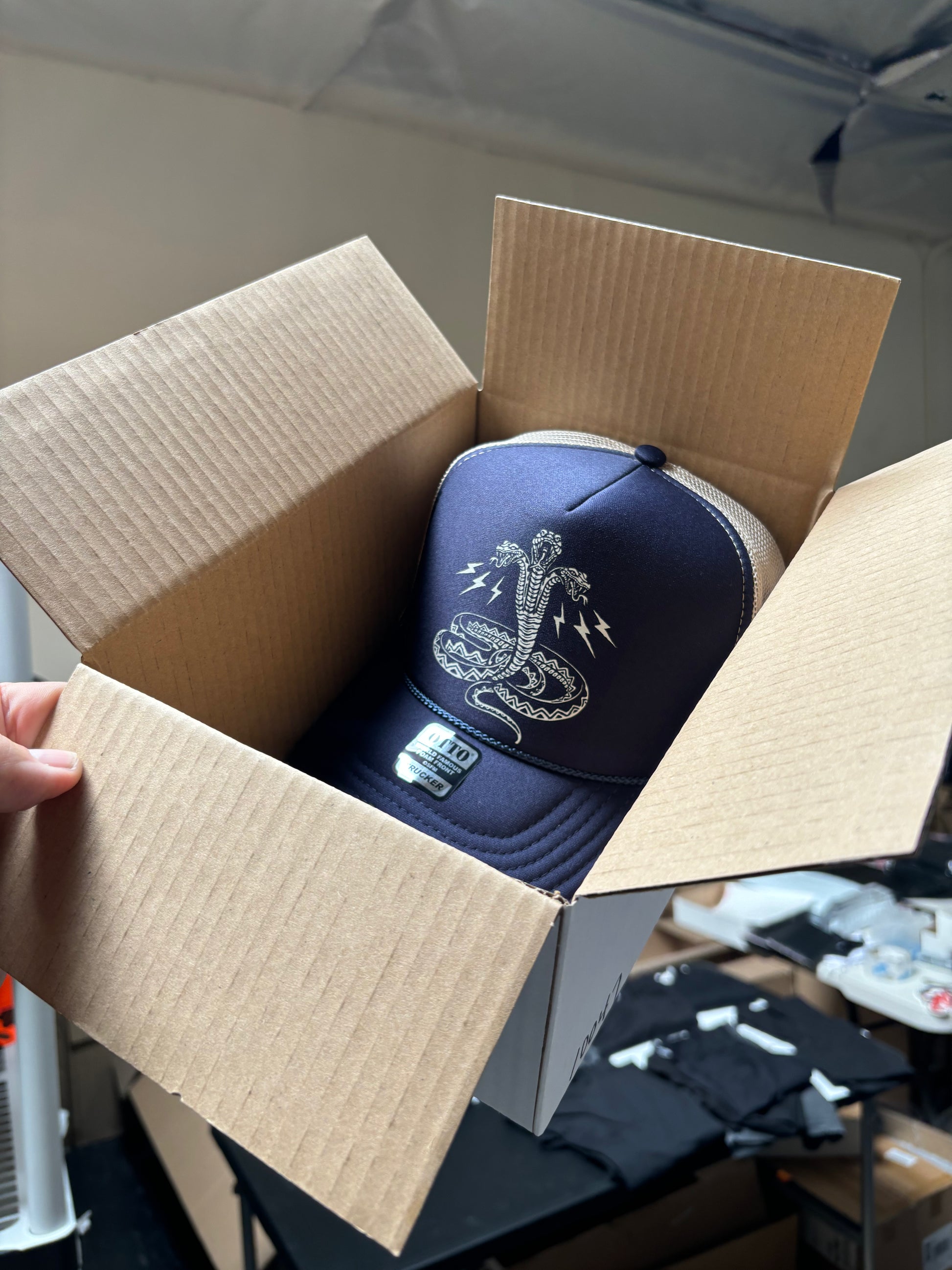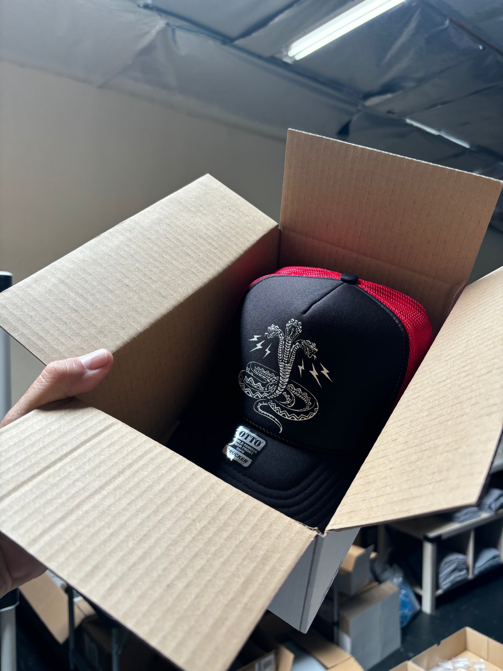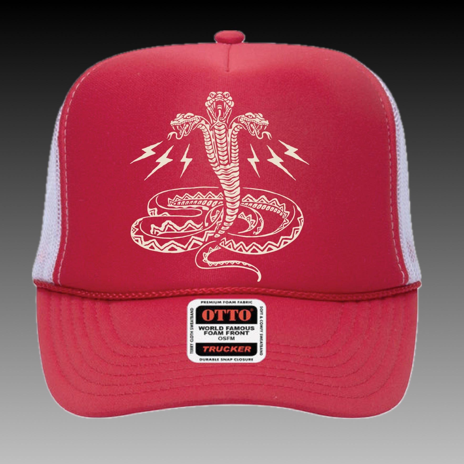 Foam front, mesh back. Plastic adjustable strap. One size fits most.