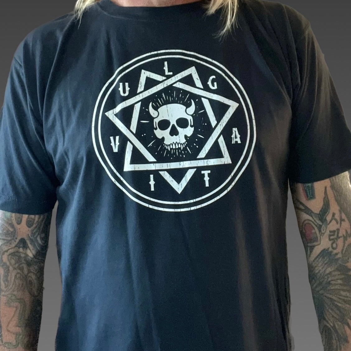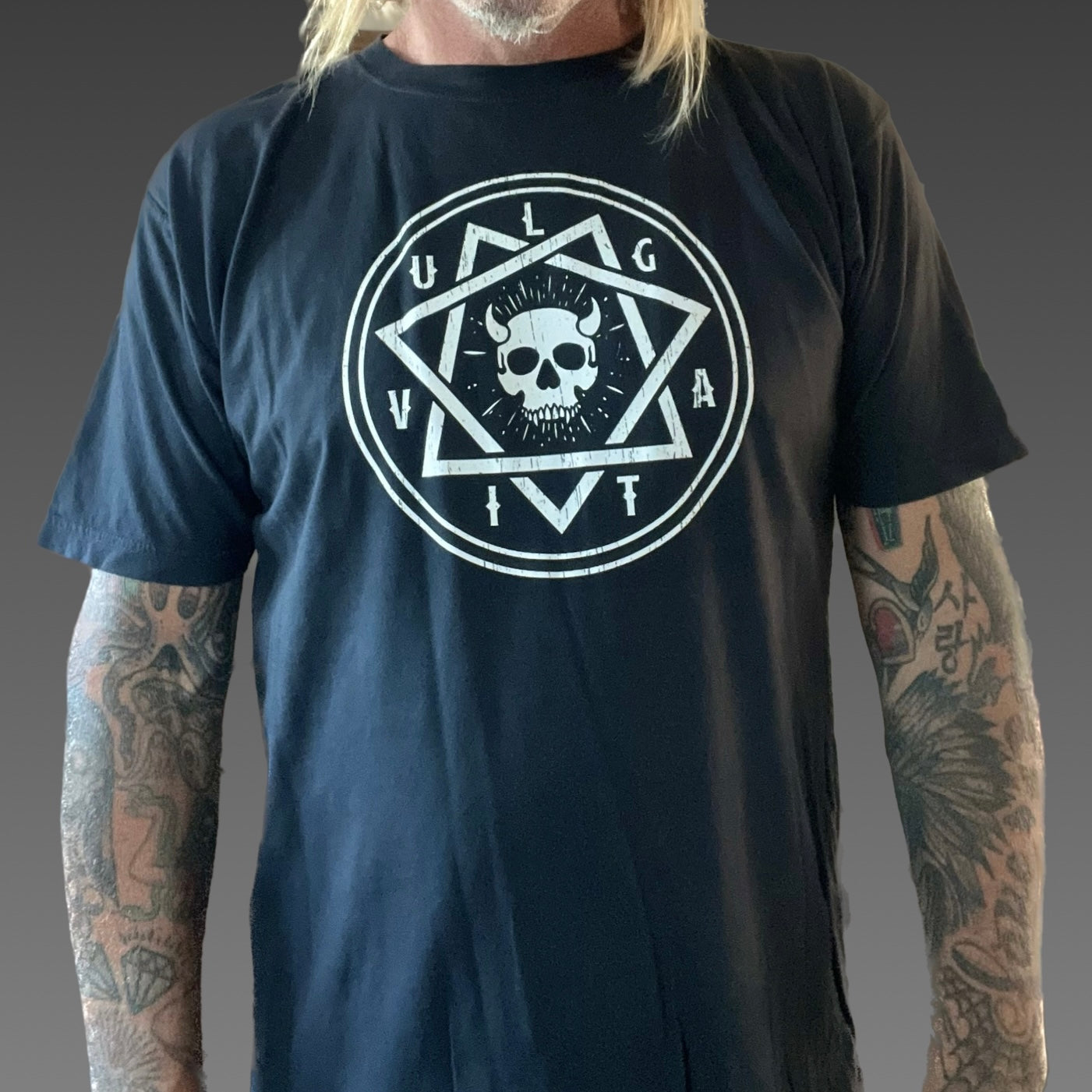 Super soft, Vintage Looking tee, Pigment Dyed with Vulgati Circle Beast Skull heat applied front chest.