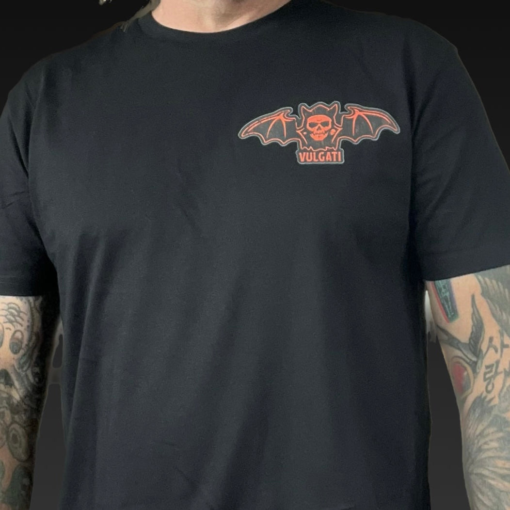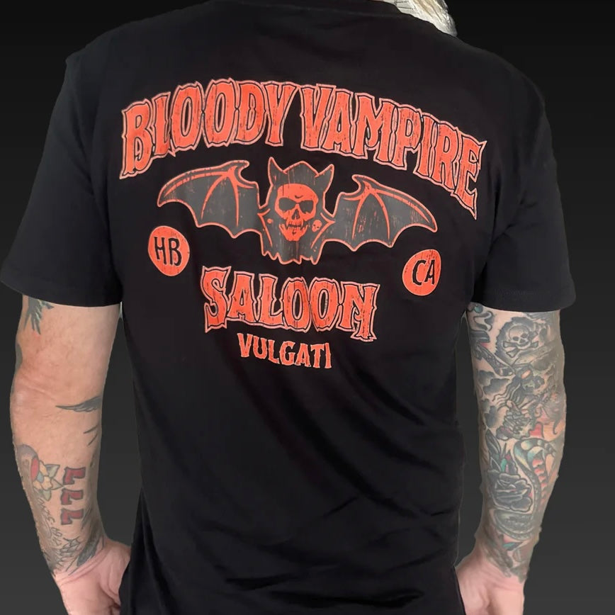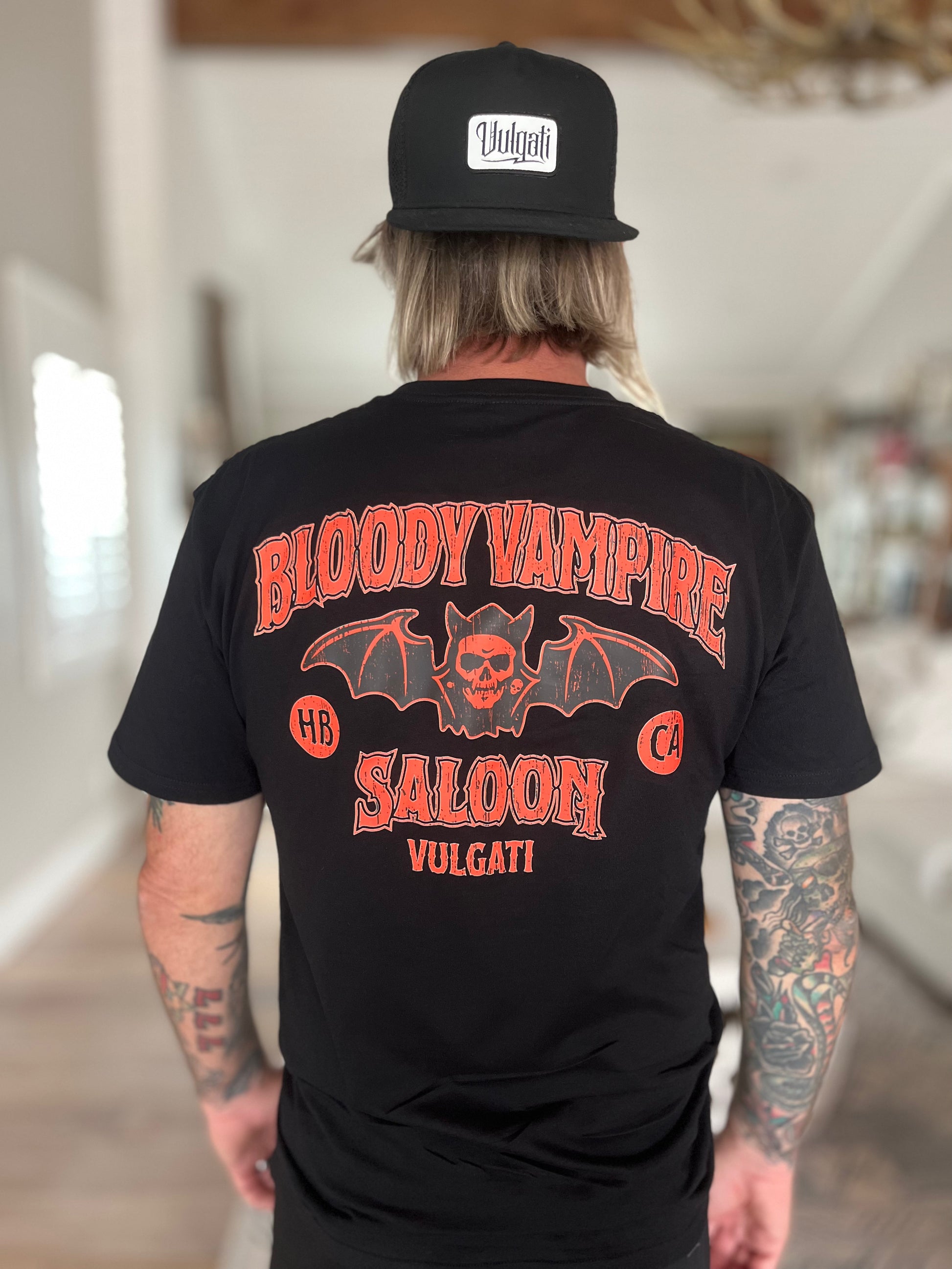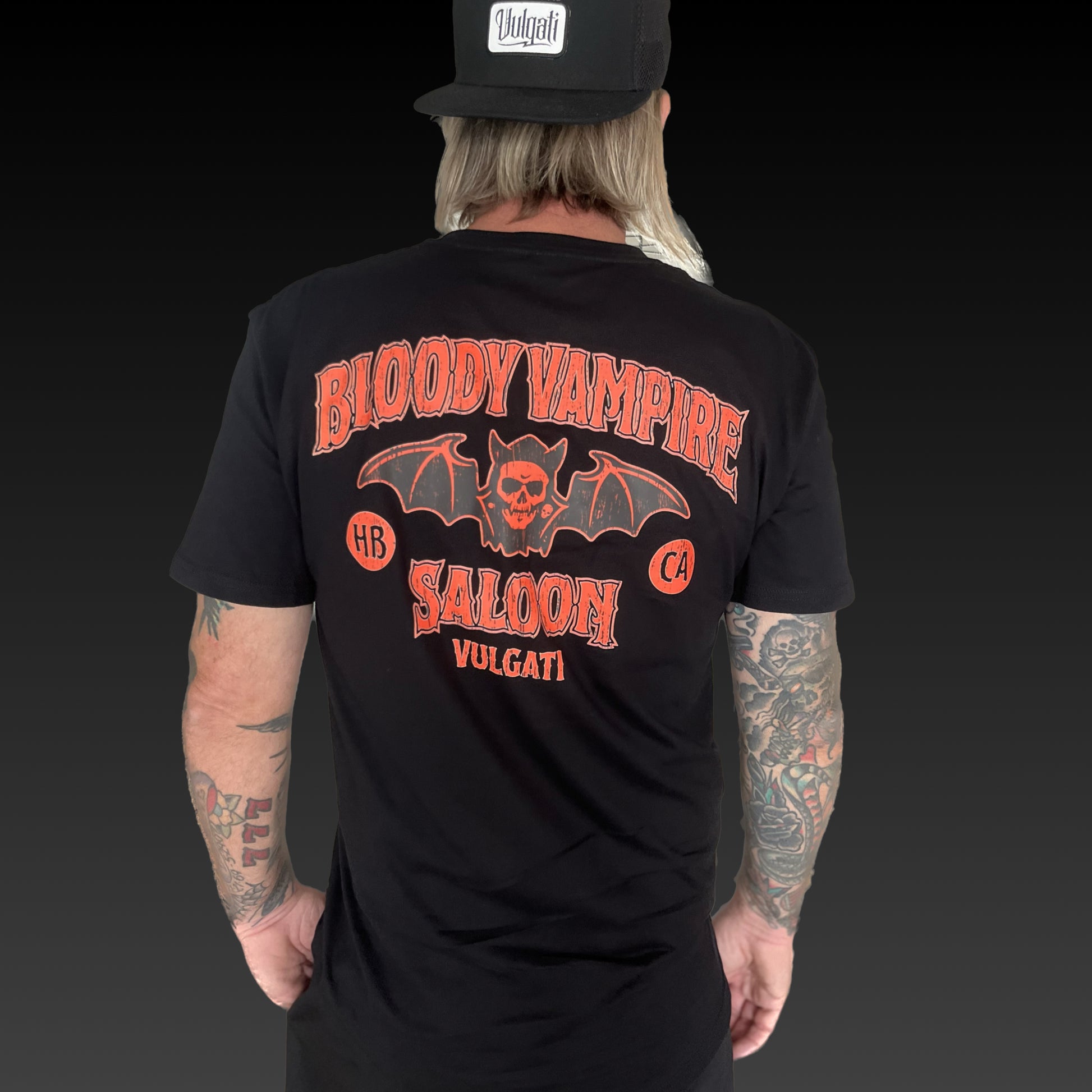 Heat transferred print at left chest and rear back, Bloody Vampire Saloon.