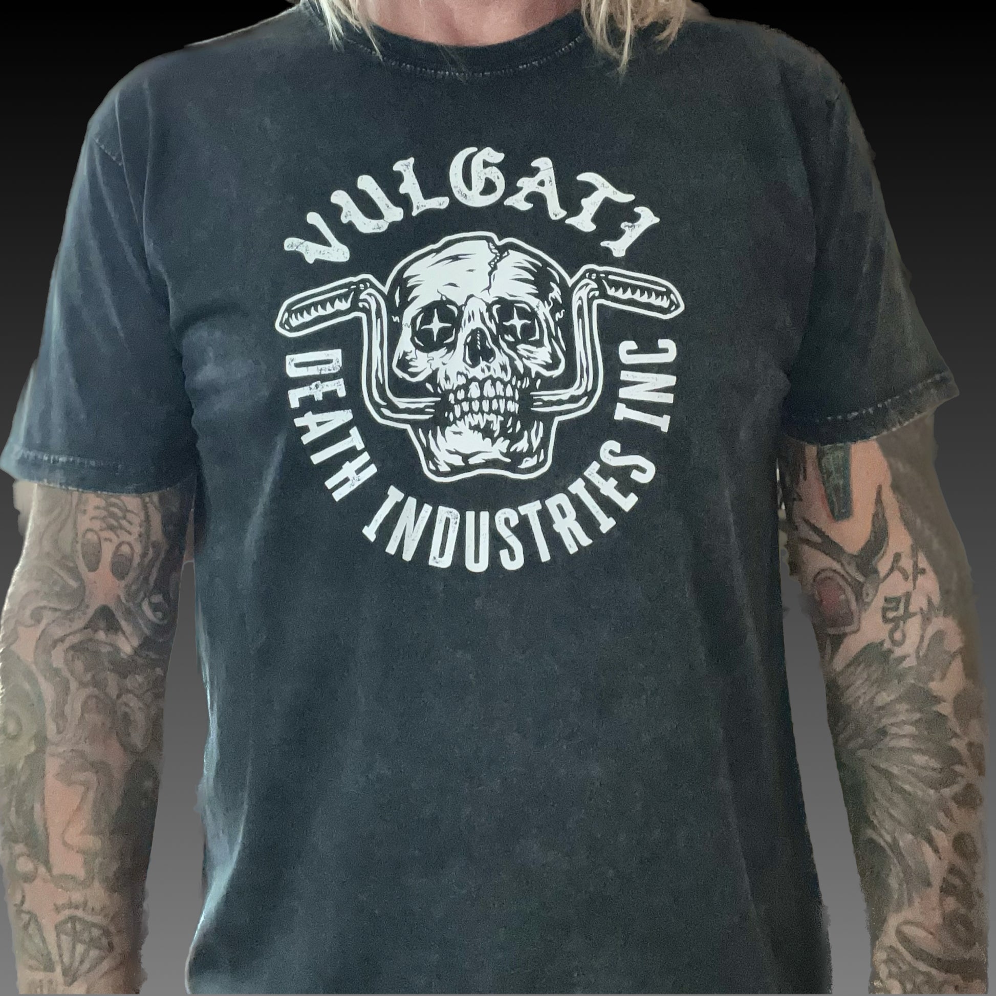 Vulgati RoadKill biker skull heat transfer print at center chest. Stone washed for that used and abused feel.
